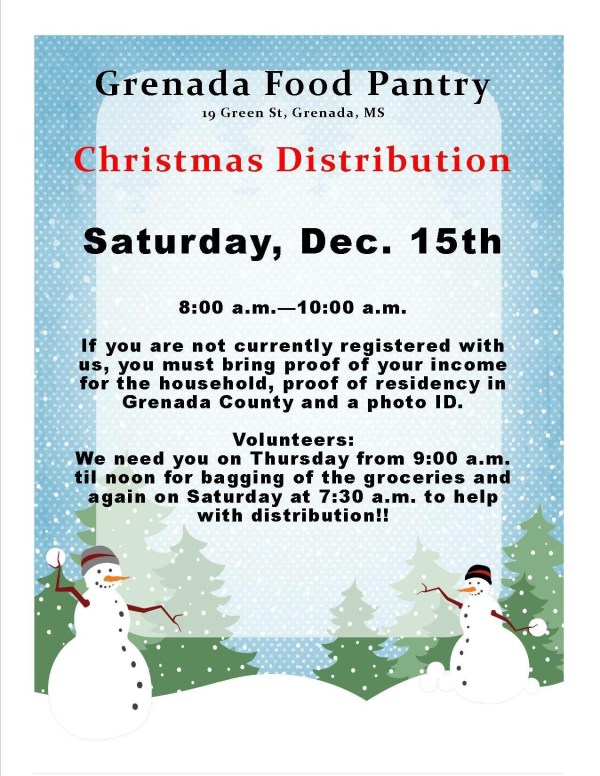 Distribution at the Grenada Food Pantry is the 4th Saturday of every month except November and December when it is held the 3rd Saturday.